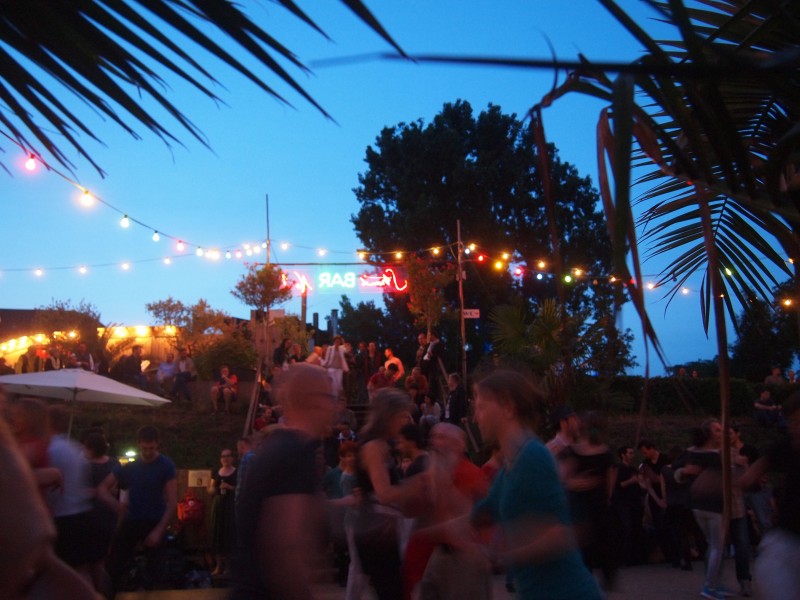 As the evening becomes dark, I stand on the bridge and hear the swing music start: the dancers dancing, the river flowing.